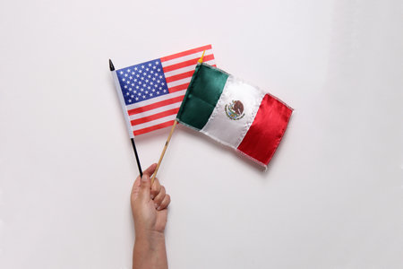 Hands holding flags of Mexico and the United States as a representation of international relations between the governments of the countries