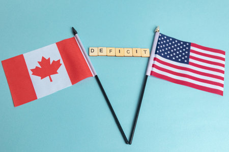 The Flags of The United States and Canada trade war concept, with tiles reading Deficit