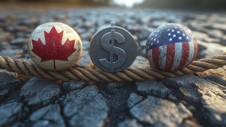 Two orbs representing Canada and the USA flank a central dollar sign, set against a rugged pavement backdrop, symbolizing trade and relations between the two nations.