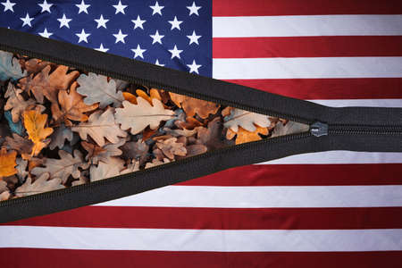 Unbuttoned zipper banner United States America and autumn foliage from fallen oak on background