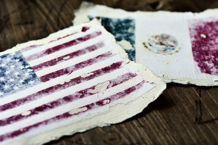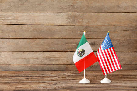 the flag of United States and the flag of Mexico in two aged pieces of paper on a rustic wooden background