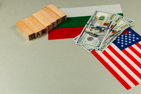 Blocks spelling tariffs are placed alongside US and Albania flags, symbolizing the complex political and economic negotiations surrounding trade.