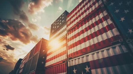 A creative 3D composition featuring the letters USA constructed from shipping containers painted in red, white, and blue with stars and stripes. This image powerfully represents American industry, trade, and national pride.