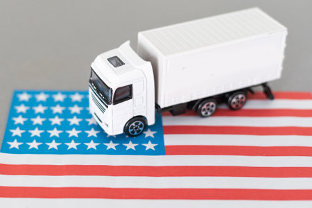 Miniature toy at table with white background. There is american flag on toy of truck.