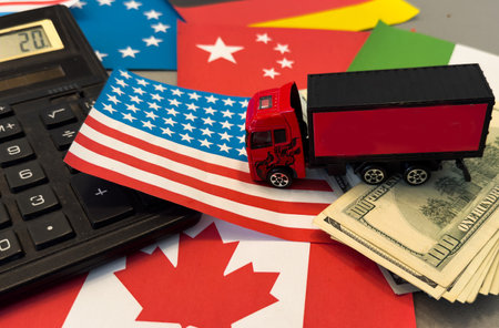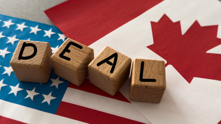 Tariffs between the United States and Canada. USA and Canadian flags, and wooden cubes with word tariffs.