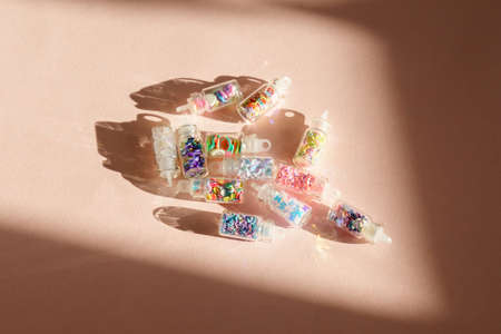 Glitter bottles for nail service, various nail design tools, glitter. hard shadow, bright sun