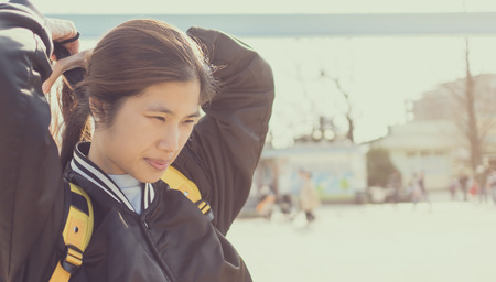 Teenager traveler tying her hair up