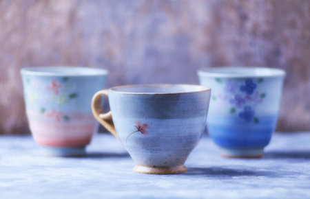 Three cups on a blue background. Selective focus.