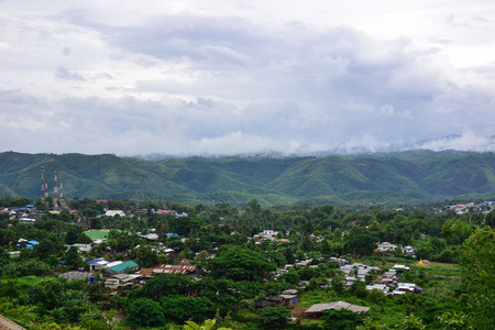 Landscape view of green mountain and small village stay near entrance hill in north of Thailand. Beauty in nature and live with natural. Beautiful forest or Tropical jungle concept.