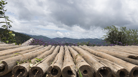 wooden bamboo table with verbena flower and mountain for montage or display your product