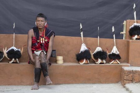 Naga Tribesmen siting dressed in traditional warrior attire during Hornbill Festival in Nagaland India on 2 December 2016