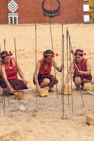 Naga women wearing their traditional ethnic attire siting and performing a traditional tribal ritual in Kisama heritage village in Nagaland India during hornbill festival on 4 December 2016