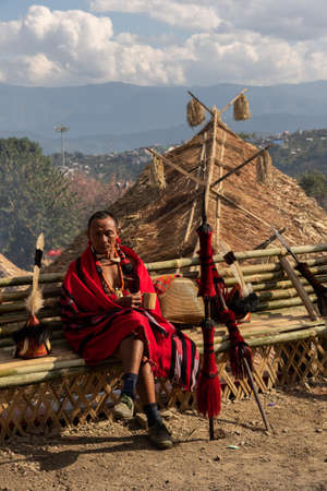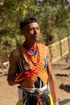 A Naga Tribesman dressed in tribal Attire holding a tribal weapon in one hand and smoking a pipe at Kisama village in Nagaland India on 2 December 2016