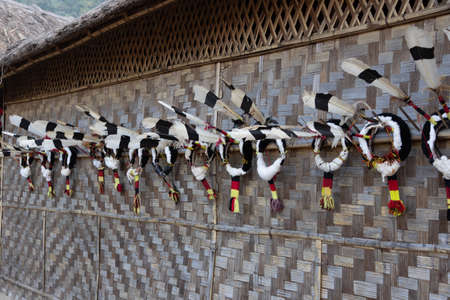 Traditional Naga head gear made of Hornbill feathers hanging on the wall of a traditional Naga hut
