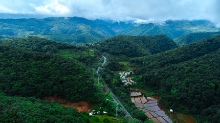 Early morning sunlight illuminating a remote mountain village in Chiang Mai Province, Thailand, reveals the tranquil beauty of lush mountains stretching into the distance