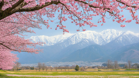 A serene winding road lined with blooming cherry trees leads towards majestic mountains capped with snow, providing a perfect spring landscape.