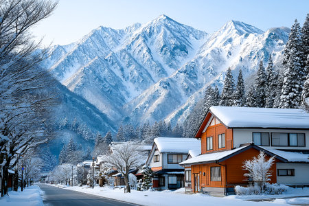 Snow blankets quaint houses lined along a road as towering mountains rise in the background. The winter landscape showcases a serene and picturesque setting.
