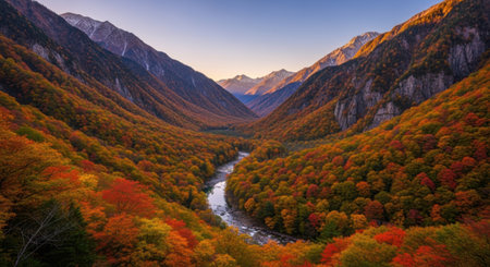 A mountain stream glistens, carving through a breathtaking autumn landscape Vibrant reds, oranges, and yellows paint the forest, while towering mountains stand guard under a clear blue sky This serene scene captures the essence of fall's majestic beauty AI Generative