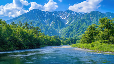 Majestic Hotaka Mountains overlooking the peaceful Azusa River in Kamikachi, surrounded by fresh greenery, capturing the untouched beauty of Nagano's natural landscape.