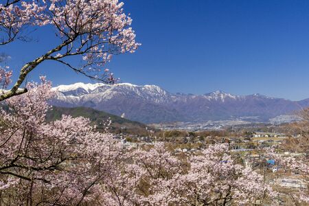 Cherry blossoms in full bloom in Takato Castle Ruins Park and the Japanese Alps