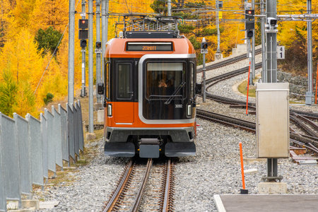 ZERMATT, SWITZERLAND - OCTOBER 19, 2025: Red Train of Gornergrat Railway Approaching Riffelalp Station. Yellow Golden Larches in Autumn. Swiss Alps. Zermatt, Valais, Switzerland