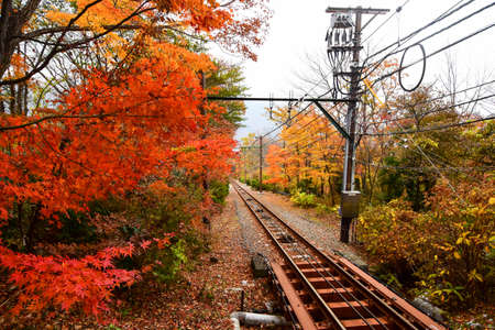Top view of Autumn colors surround Sagano romantic train railway, Arashiyama, Kyoto, Japan