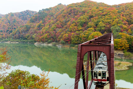 Autumn fall foliage with white train commuter in Fukushima Japan