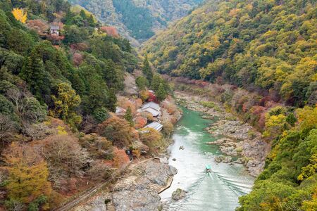 Scenery aerial top view of season change of autumn blooming in mountain along the river of Arashiyama in Kyoto, Osaka, Japan, popular tourist place for visit Japan