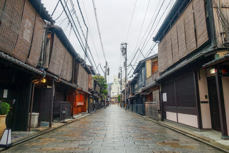 Japanese walk way in Gion town old traditional wooden home district alley quiet calm travel place in Kyoto Japan.