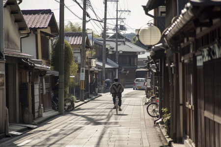 This serene street scene captures the beauty of a traditional Japanese town, showcasing charming architecture and vibrant greenery. The clear sky enhances the peaceful ambiance, inviting exploration and showcasing cultural heritage.