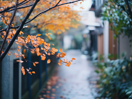 A peaceful street in a quaint Japanese town lined with bicycles, showcasing traditional architecture and beautiful autumn foliage, inviting exploration.