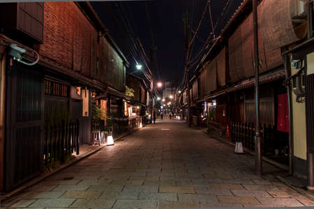 Gion Kyoto red lights district at night, narrow street and lanterns