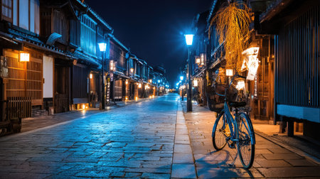 A woman wearing a kimono walks on a cobblestone street. The scene features traditional architecture and illuminated lanterns. The composition is atmospheric with a soft glow, suggesting a nighttime or twilight setting. Suitable for various editorial and commercial applications, the image highlights cultural themes.