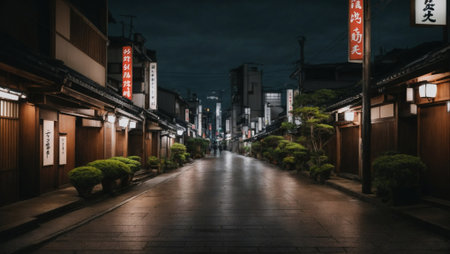 Discover a tranquil and picturesque traditional Japanese street, featuring charming wooden houses, lush greenery, and cobblestone paths. Ideal for travel and culture themes.