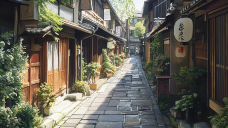A peaceful alleyway lined with traditional Japanese shops. Lush greenery and paper lanterns add to the serene atmosphere