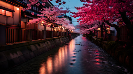 View of Japanese Kyoto with flourishing cherry blossoms. Sakura season. AI generated.