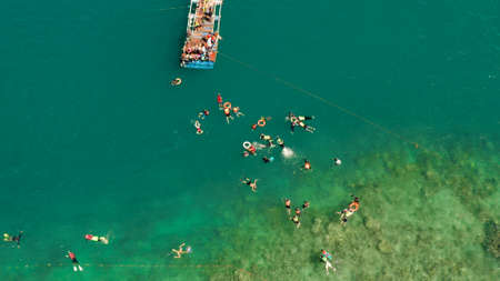 Tourists snorkeling over coral reef with clear blue ocean water, aerial view. People swim in the transparent sea between coral reefs. Summer and travel vacation concept.