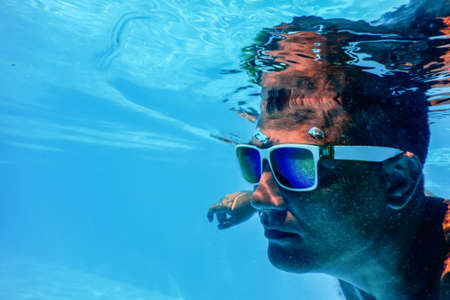 Pool Summer Party, Man with Sunglasses Underwater in Swimming Pool