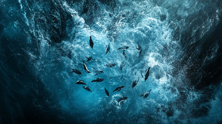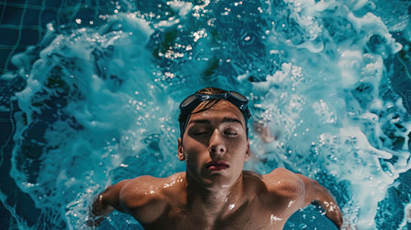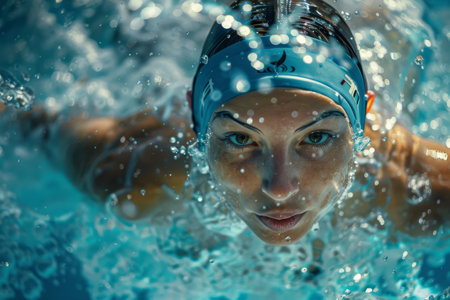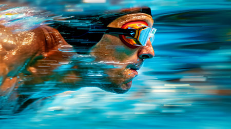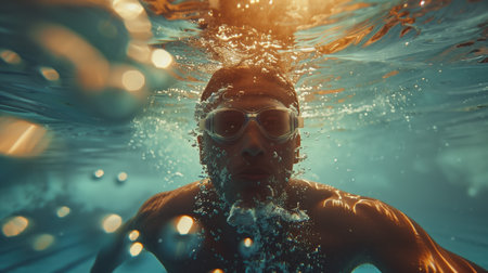 A captivating underwater shot of a swimmer in mid-stroke wearing goggles. The image captures the dynamic movement, bubbles, and vibrant lighting. Ideal for themes related to swimming, sports, fitness, and aquatic activities.