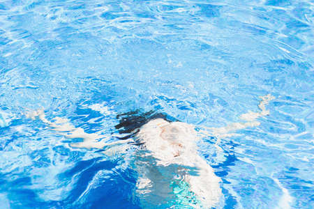 Man in the blue water of the pool or in the sea. The guy touches his face with his hands after immersion in water. Gentle sun glare in the water. Vacation and travel concept.