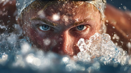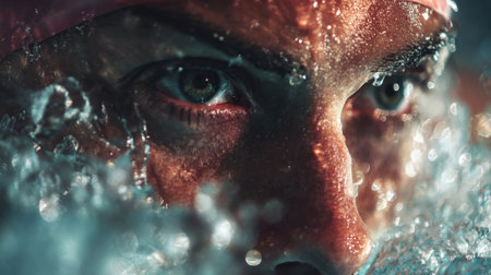 Close-up of a swimmers face in motion, slicing through water with determination in their eyes.