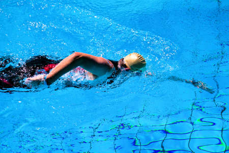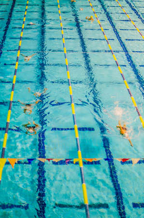 Young boy swimmers raceing furiously in freestyle stroke at a local pool