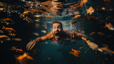 A businessman in surprise swims among vibrant tropical fish underwater, expressing excitement and awe in a dark aquatic setting.
