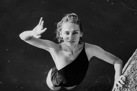 Young beautiful woman standing in the water. Black swimsuit. Vintage style. Black and white