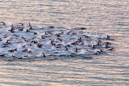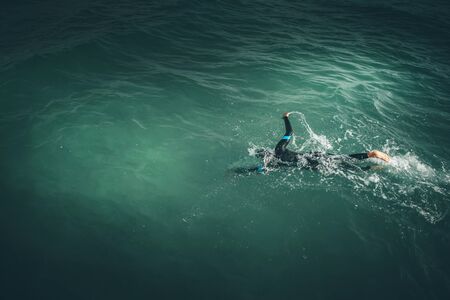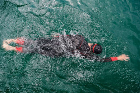 Triathlon swimmer churning up the water in the sea.. Athlete practicing for triathletic race in lak