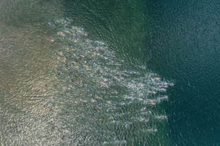 Triathlon swimming contest in lake swimmers competition aerial drone photo