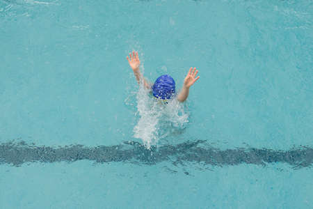 top view of a 7-year boy swimming backstroke in a swimming pool