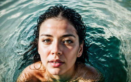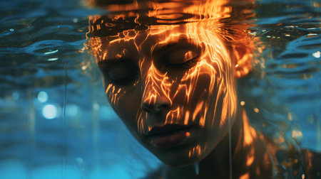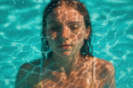 Dreamy Woman Behind Sunlit Pool Water With Sparkling Ripples And Droplets