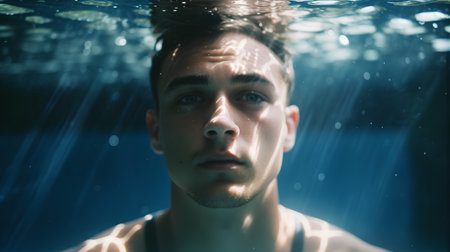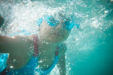 Close up of a determined young swimmer submerged, surrounded by bubbles and light.