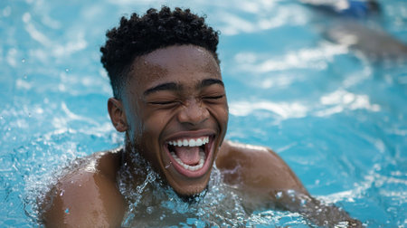 A young man is laughing and splashing water in a pool. Scene is lighthearted and fun